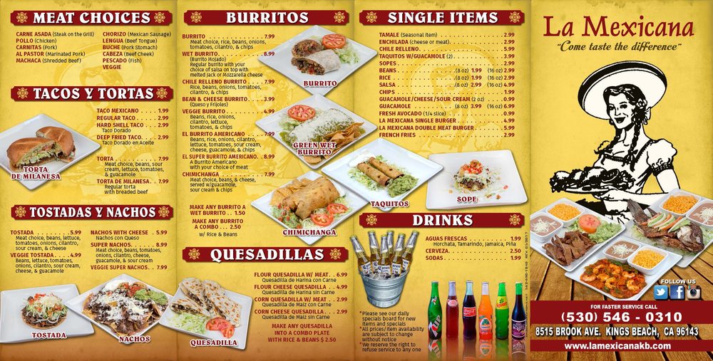La Mexicana, a fast-food Mexican restaurant located at 8515 Brook Ave Kings Beach, CA 96143, offers a variety of delicious dishes with vegan options. The restaurant is Latinx-owned, women-owned, and gender-neutral, providing a welcoming and inclusive atmosphere. Known for its accessibility features, La Mexicana also offers drive-thru service, TV entertainment, and heated outdoor seating. The menu includes options for takeout, delivery, and catering, making it perfect for groups, families, and individuals alike. With a focus on sustainable practices, the restaurant provides compostable containers and plastic-free packaging. From street parking to private lot parking, La Mexicana ensures convenience for all customers. Don't miss the opportunity to taste the authentic flavors of Mexico in a welcoming setting at La Mexicana.